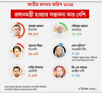 আগামী জাতীয় সংসদ নির্বাচনের পর যে সরকার গঠিত হবে, এর প্রধানমন্ত্রী হিসেবে বিএনপির ভারপ্রাপ্ত চেয়ারম্যান তারেক রহমানের সম্ভাবনা বেশি দেখছেন মানুষ। আর প্রায় এক–চতুর্থাংশ মানুষ জামায়াতে ইসলামীর আমির শফিকুর রহমানের প্রধানমন্ত্রী হওয়ার সম্ভাবনা দেখছেন।