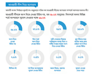 জরিপে প্রশ্ন করা হয়েছিল, আগামী জাতীয় সংসদ নির্বাচনে গণ–অভ্যুত্থানে পতিত দল আওয়ামী লীগের অংশগ্রহণ সম্পর্কে আপনার মতামত কী? এই প্রশ্নে ২৭ দশমিক ৮ শতাংশ উত্তরদাতা বলেছেন, বিনা শর্তে আওয়ামী লীগকে ভোটে অংশ নিতে দেওয়া উচিত। ২৬ শতাংশ উত্তরদাতার মতে, শাস্তি ও সংস্কার হলে আওয়ামী লীগ নির্বাচনে অংশ নিতে পারে। ১৪ দশমিক ৮ শতাংশ মনে করেন, আনুষ্ঠানিকভাবে ক্ষমা চাইলে আওয়ামী লীগকে নির্বাচনে অংশ নেওয়ার সুযোগ দেওয়া যেতে পারে।